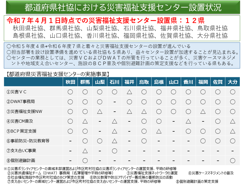 (図:災害福祉支援センターが設置されている12の県社協での実施事業の一覧/令和7年4月時点)